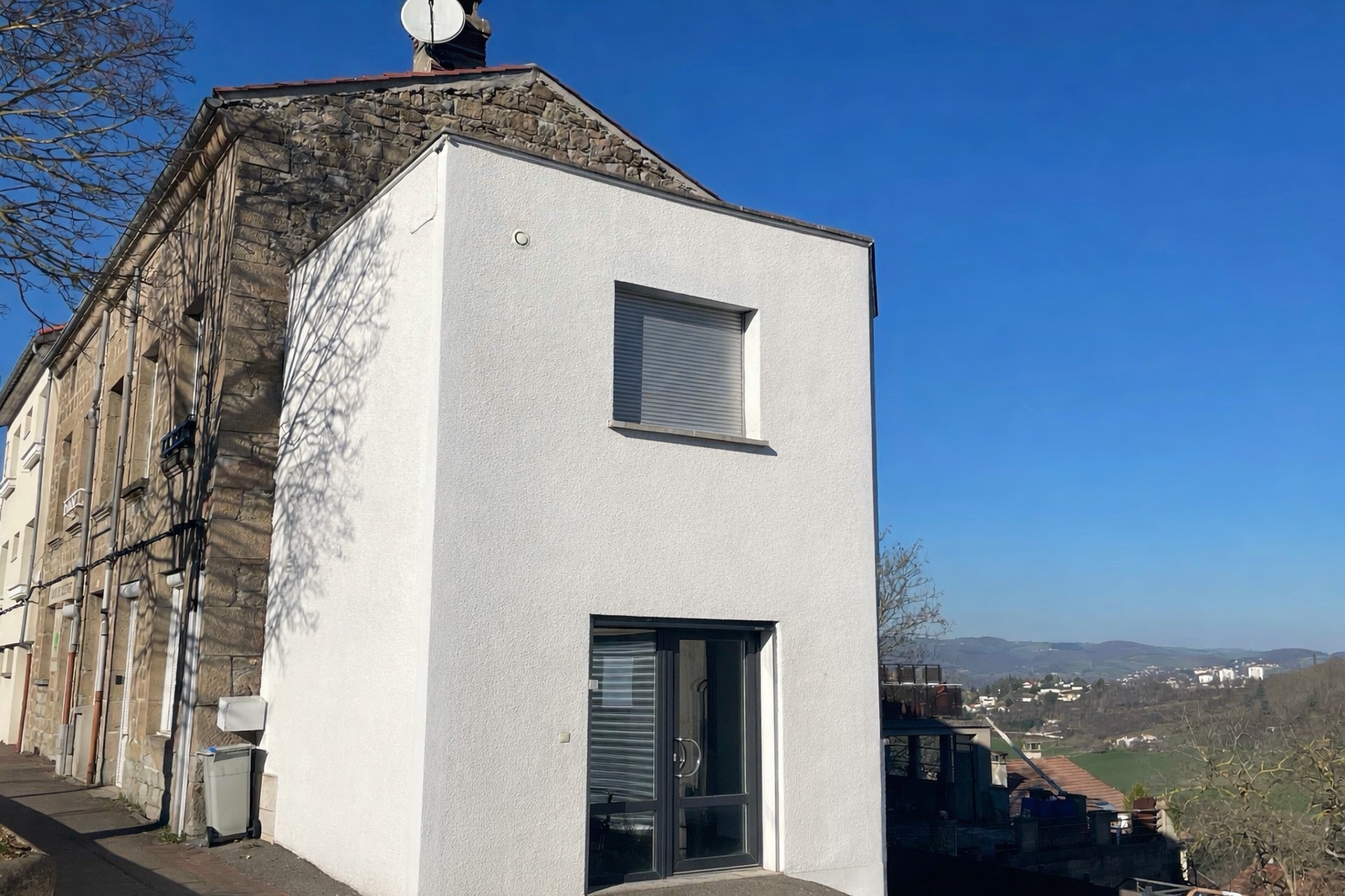 Au rez de chaussée, un accueil de15 m2, une terrasse, une cuisine ouverte, des sanitaires et deux bureau. A l'étage, un vaste bureau de 16 m2.